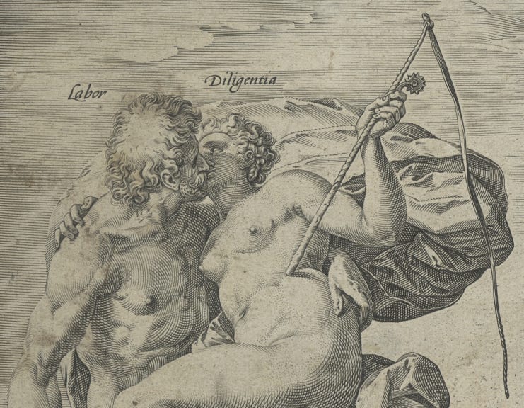 [The illustration at the top is a detail of a bit of allegorizing soft-porn Mannerism by Hendrick “Muscle Mag” Goltzius — take a gander at his MCU-avant-la-lettre “Knollenman” Hercules sometime to discover why I attach that nickname to him — who for this 1582 piece, and somewhat unusually for the period, both invenit and sculpsit. The names of the labeled principals are I think false friends friendly enough to require no translation.]